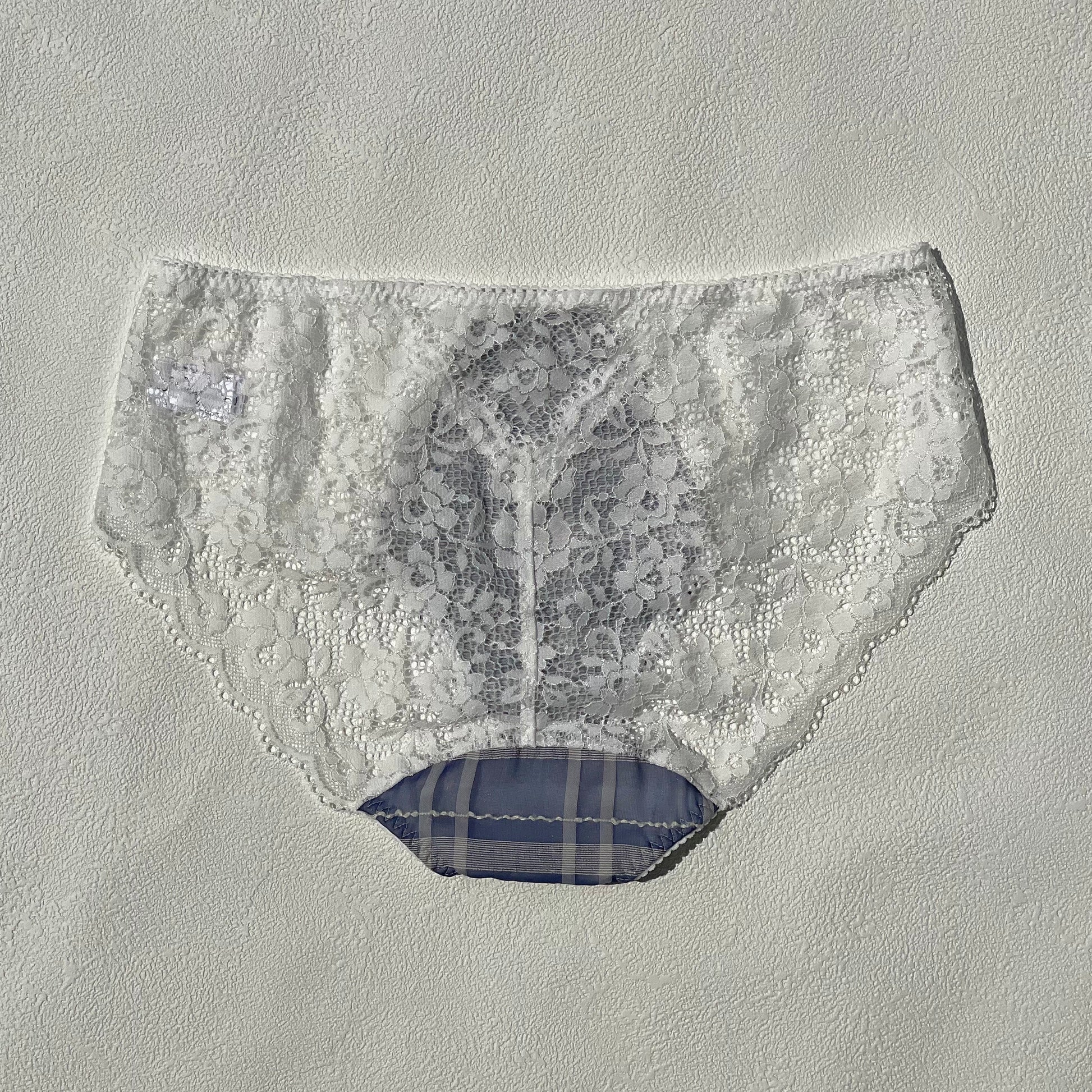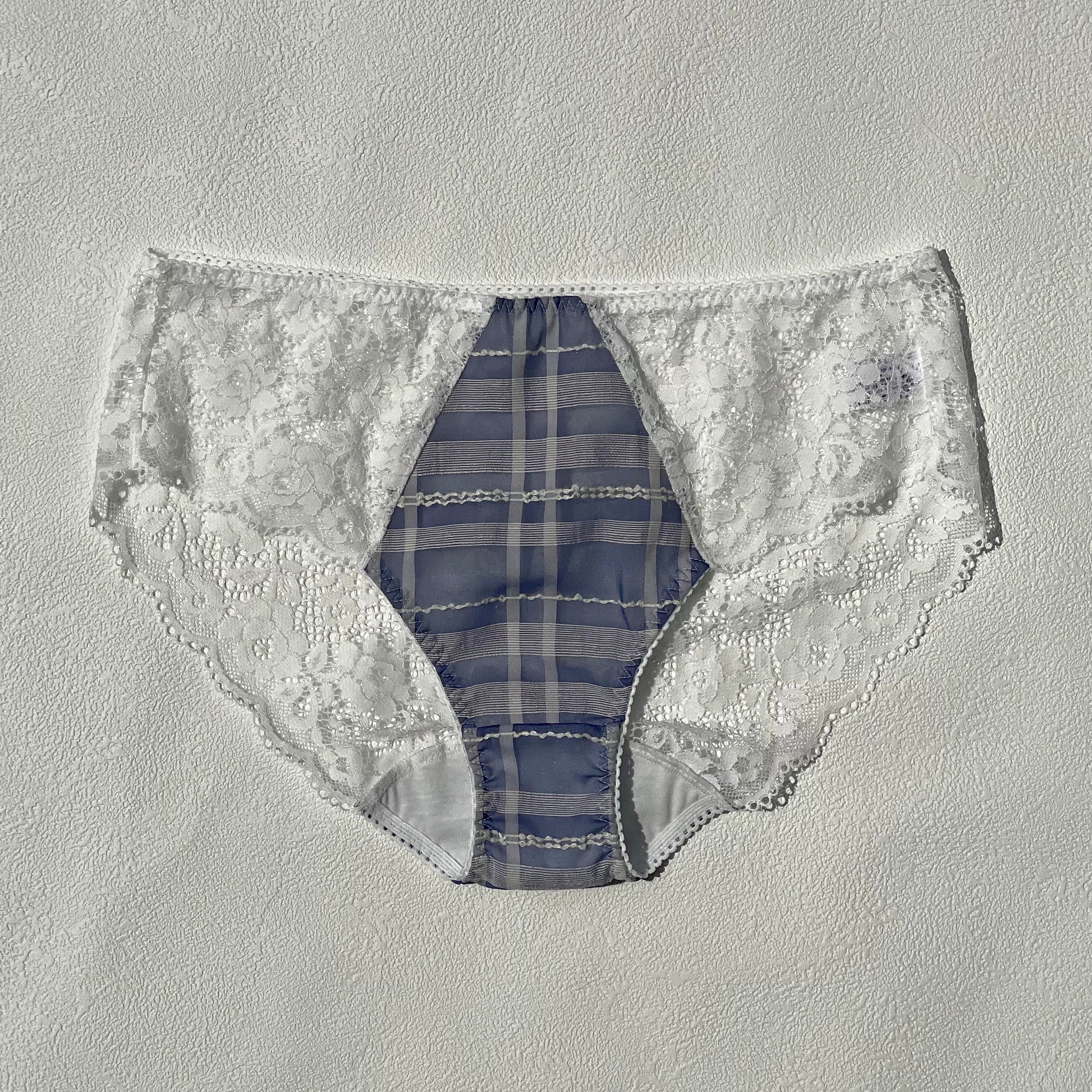 The combination of soft blue checks and delicate lace with a hint of cotton creates a light, airy, and elegant look.